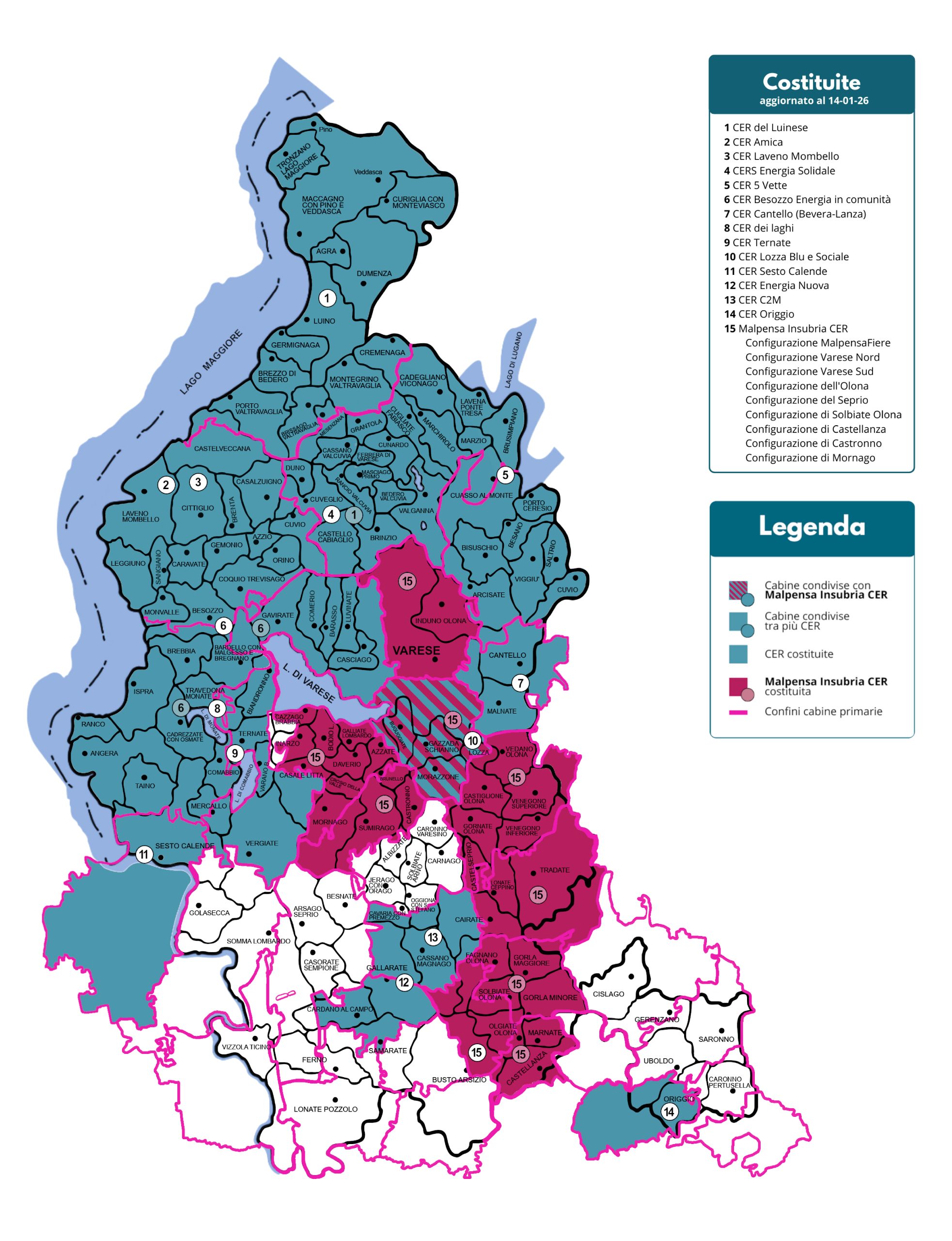 Questa mappa mostra le CER già attive in provincia di Varese basandosi sulla suddivisione delle aree per cabine primarie, i cui confini sono evidenziati in rosso.
